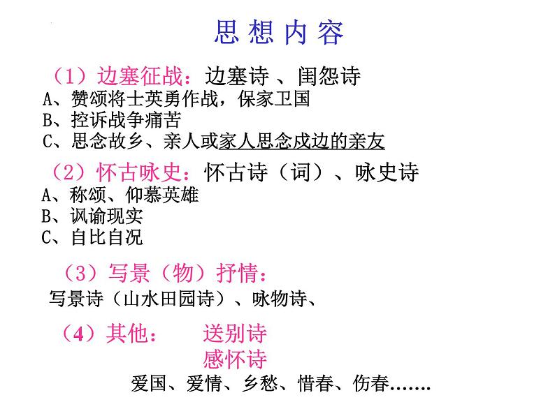 (1)边塞征战:边塞诗 、闺怨诗A、赞颂将士英勇作战,保家卫国B、控诉战争痛苦C、思念故乡、亲人或家人思念戍边的亲友