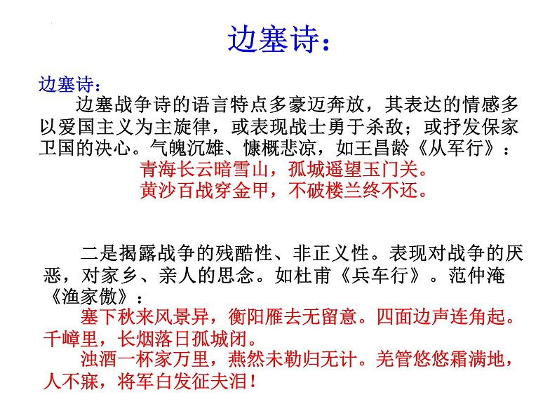边塞诗: 边塞战争诗的语言特点多豪迈奔放,其表达的情感多以爱国主义为主旋律,或表现战士勇于杀敌;或抒发保家卫国的决心。气魄沉雄、慷概悲凉,如王昌龄《从军行》:青海长云暗雪山,孤城遥望玉门关。黄沙百战穿金甲,不破楼兰终不还。