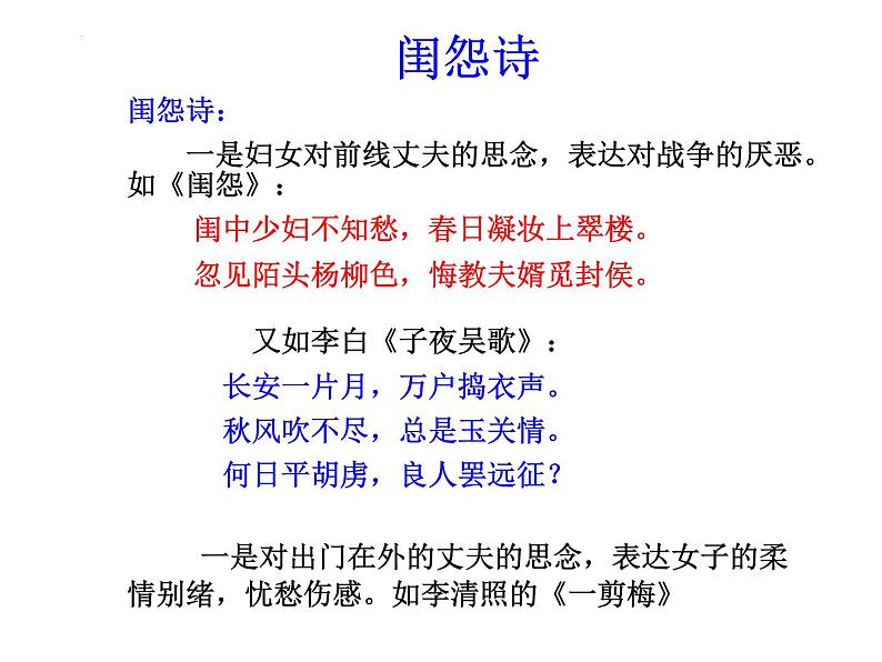 闺怨诗: 一是妇女对前线丈夫的思念,表达对战争的厌恶。如《闺怨》: 闺中少妇不知愁,春日凝妆上翠楼。 忽见陌头杨柳色,悔教夫婿觅封侯。