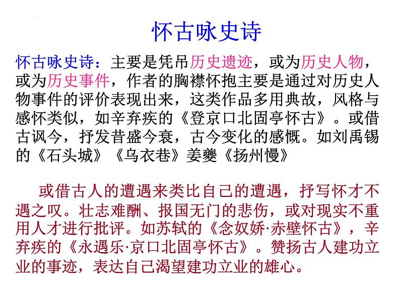 怀古咏史诗:主要是凭吊历史遗迹,或为历史人物,或为历史事件,作者的胸襟怀抱主要是通过对历史人物事件的评价表现出来,这类作品多用典故,风格与感怀类似,如辛弃疾的《登京口北固亭怀古》。或借古讽今,抒发昔盛今衰,古今变化的感慨。如刘禹锡的《石头城》《乌衣巷》姜夔《扬州慢》