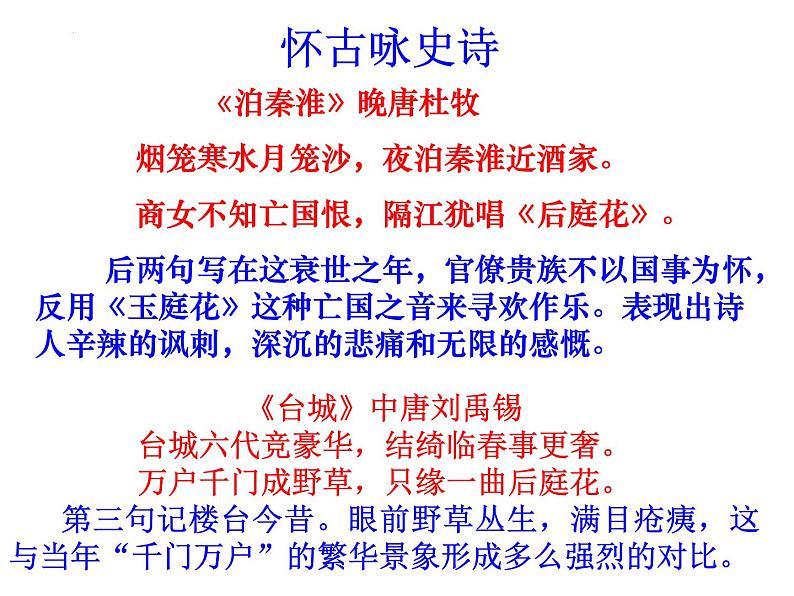 《泊秦淮》晚唐杜牧 烟笼寒水月笼沙,夜泊秦淮近酒家。 商女不知亡国恨,隔江犹唱《后庭花》。 后两句写在这衰世之年,官僚贵族不以国事为怀,反用《玉庭花》这种亡国之音来寻欢作乐。表现出诗人辛辣的讽刺,深沉的悲痛和无限的感慨。