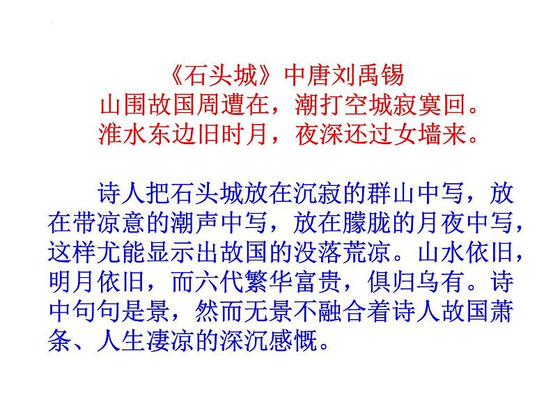 《石头城》中唐刘禹锡山围故国周遭在,潮打空城寂寞回。淮水东边旧时月,夜深还过女墙来。 诗人把石头城放在沉寂的群山中写,放在带凉意的潮声中写,放在朦胧的月夜中写,这样尤能显示出故国的没落荒凉。山水依旧,明月依旧,而六代繁华富贵,俱归乌有。诗中句句是景,然而无景不融合着诗人故国萧条、人生凄凉的深沉感慨。