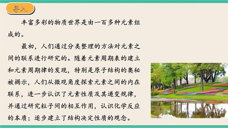 丰富多彩的物质世界是由一百多种元素组成的。最初,人们通过分类整理的方法对元素之间的联系进行研究的。随着元素周期表的建立和元素周期律的发现,特别是原子结构的奥秘被揭示,人们从微观角度探索元素之间的内在联系,进一步认识了元素性质及其递变规律,并通过研究粒子间的相互作用,认识化学反应的本质;逐步建立了结构决定性质的观念。