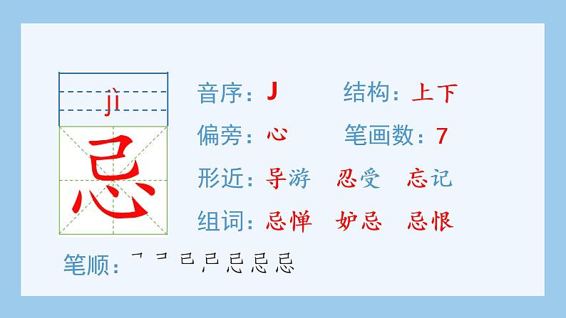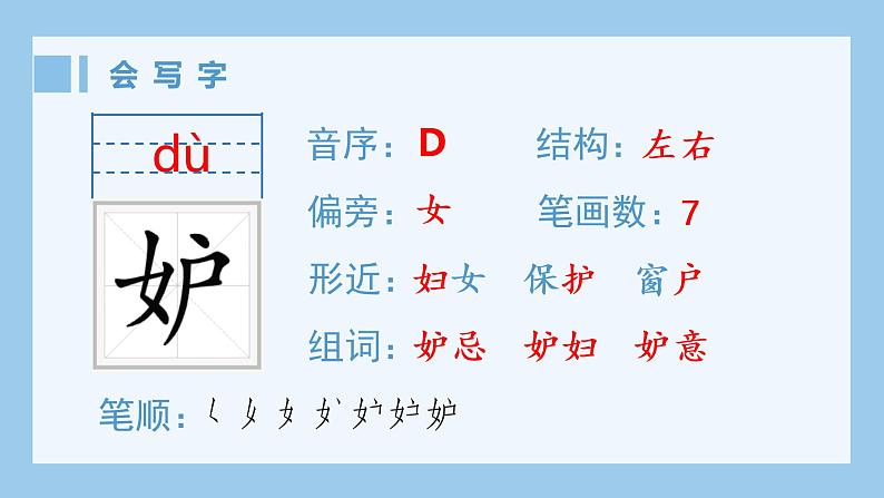 课时目标:1.认识“忌、瑜”等9个生字,会写“妒、忌”等11个字,掌握“妒忌、委托”等词语。2.默读课文,能按照起因、经过、结果的顺序说出故事的主要内容。(重点)