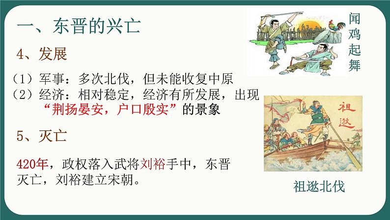 这是一份初中历史人教部编版七年级上册第十八课 东晋南朝时期江南地区的开发教学ppt课件,共33页。PPT课件主要包含了闻鸡起舞,中流击楫,南朝与北朝等内容,欢迎下载使用。