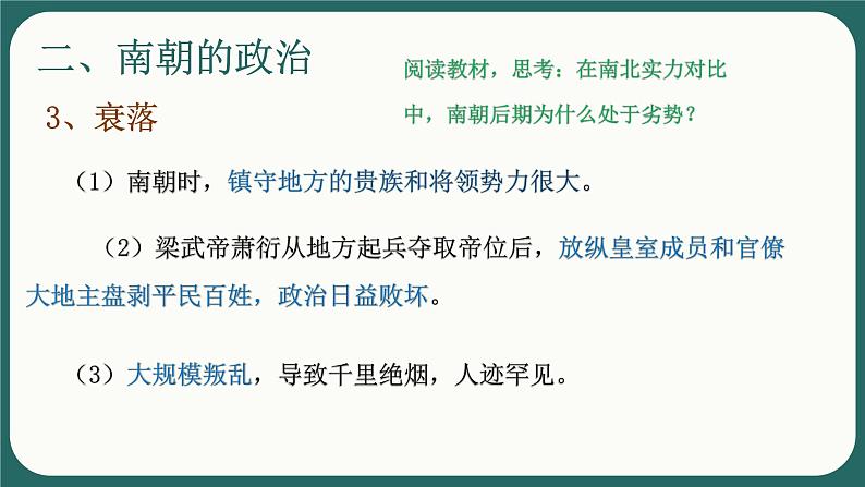 阅读教材,思考:在南北实力对比中,南朝后期为什么处于劣势?