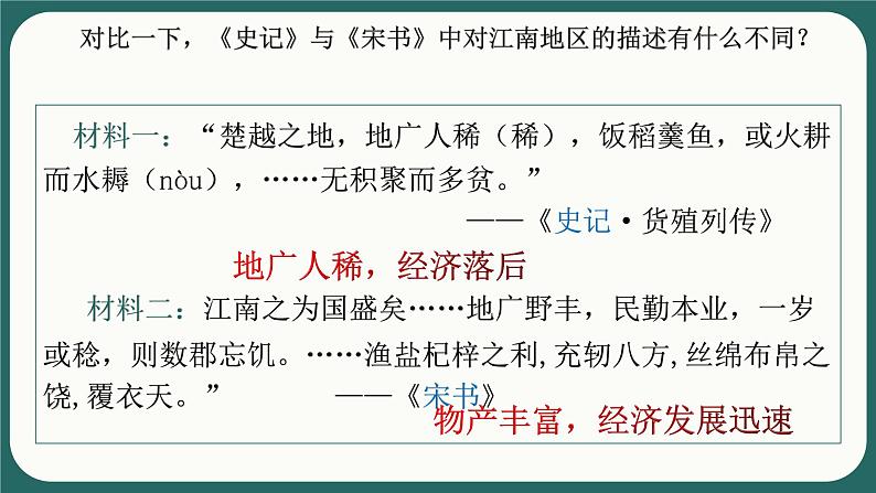 材料一:“楚越之地,地广人稀(稀),饭稻羹鱼,或火耕而水耨(nòu),……无积聚而多贫。” ——《史记·货殖列传》 材料二:江南之为国盛矣……地广野丰,民勤本业,一岁或稔,则数郡忘饥。……渔盐杞梓之利,充轫八方,丝绵布帛之饶,覆衣天。” ——《宋书》