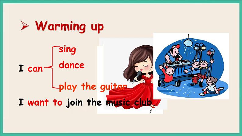 1.What club d yu want t jin? 你想参加什么俱乐部呢? 1)what在此处用于修饰club。 2)want后接动词不定式做宾语,意为“想做某事”。 3) jin意为“参加;加入”。jin后面常接表示团体的 名词,表示加入某团体或成为 某团体的一员;也常 接人称代词的宾格形式,表示和某人一起进行某活动。