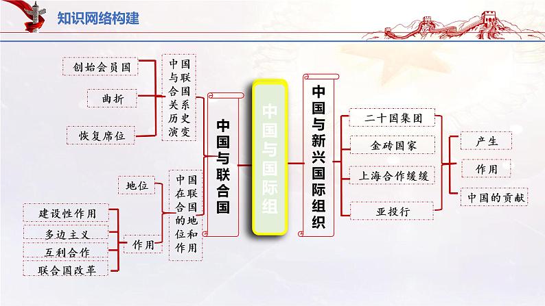 这是一份19.2中国与国际组织(课件帮)-备战2023年高考政治一轮复习考点帮(统编版),共22页。PPT课件主要包含了知识网络构建,中国与新兴国际组织,中国与联合国,二十国集团,金砖国家,上海合作缓缓,亚投行,中国的贡献,上海合作组织,易错明辨等内容,欢迎下载使用。