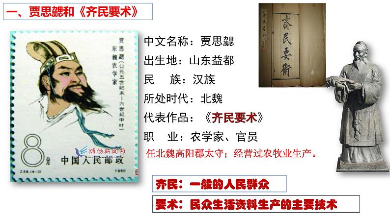 人教部编版七年级上册第四单元 三国两晋南北朝时期:政权分立与民族交融第二十课 魏晋南北朝的科技与文化教案配套ppt课件: 这是一份人教部编版七年级上册第四单元 三国两晋南北朝时期:政权分立与民族交融第二十课 魏晋南北朝的科技与文化教案配套ppt课件,共28页。PPT课件主要包含了学习重点,学习难点,贾思勰和《齐民要术》,新知讲解,贾思勰《齐民要术》,贾思勰,《齐民要术》,视频郦道元与贾思勰,贾思勰xié,祖冲之的数学成就等内容,欢迎下载使用。