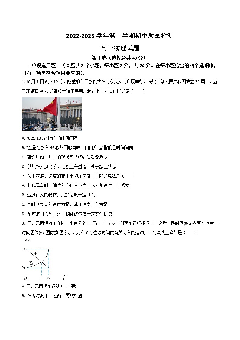 2022-2023学年第一学期期中质量检测高一物理试题第Ⅰ卷(选择题共40分)一、单项选择题:(本题共8个小题,每小题3分,共24分。在每小题给出的四个选项中,只有一项是符合题目要求的)。1. 10月1日6点10分,隆重的升国旗仪式在北京天安门广场举行,庆祝中华人民共和国成立72周年,五星红旗在46秒的国歌奏唱中冉冉升起,下列说法正确的是( )A. “6点10分”指的是时间间隔B. “五星红旗在46秒的国歌奏唱中冉冉升起”指的是时间间隔C. 研究红旗上升时的形状可以将红旗看做质点D. 以旗杆为参考系,红旗上升过程中处于静止状态2. 关于速度、速度的变化量和加速度,正确的说法是( )A. 物体运动时,速度的变化量越大,它的加速度一定越大B. 速度很大的物体,其加速度一定很大C. 某时刻物体的速度为零,其加速度一定为零D. 加速度很大时,运动物体的速度一定变化很快3. 甲、乙两辆汽车在同一平直公路上行驶,在t=0时刻两车正好相遇,在之后一段时间(0-t2)内两车速度一时间图像(v-t图像)如图所示,则在0-t2这段时间内有关两车的运动,下列说法正确的是( )A 甲、乙两辆车运动方向相反B. 在t1时刻甲、乙两车再次相遇C. 乙车在0-t2时间内的平均速度大于D. 在0-t2时间内乙车的加速度一直增大4. A、B两小球从不同高度自由下落,同时落地,A球下落的时间为t,B球下落的时间为,当B球开始下落的瞬间,A、B两球的高度差为( )A. gt2 B. gt2 C. gt2 D. gt25. 一物体由静止开始沿直线运动,其加速度随时间变化的规律如图所示,取物体开始运动的方向为正方向,则下列关于物体运动的v-t图象正确的是( )A. B. C. D. 6. 图甲为家庭常用燃气灶实物图,灶面上有一个支架。共有五个均匀分布的支承面,对放在上面的厨具起到支撑作用。现把一个蒸锅放在支架上,并抽象成示意图乙,已知支架的每个支承面与水平方向成角。蒸锅和里面的食物总重计为G,则每个支承面给蒸锅的支持力为(忽略蒸锅和支承面之间的摩擦力)( )A. B. C. D. 7. 一小汽车以72km/h做匀速直线运动,突然发现前面40m处有一障碍物,司机立即刹车,使汽车做匀减速运动,并恰好没有撞到障碍物,则( )A. 汽车刹车的加速度大小为B. 汽车刹车过程用时10sC. 从司机刹车开始计时,时汽车的速度大小为D. 从司机刹车开始计时,内汽车的位移大小为8. 如图所示,质量M=1.6kg的木块A套在水平杆上,并用轻绳将木块A与质量m=1.4kg的小球相连。今用与水平方向成37°角的力F=10N拉着球带动木块一起向右匀速运动,运动中M、m相对位置保持不变,不计空气阻力,g=10m/s2。则下列计算结果正确的是( )A. 运动过程中绳的拉力大小B. 绳与水平方向的夹角C. 末块与水平杆间的动摩擦因数D. 绳与水平方向的夹角二、多项选择题:(本题共4个小题,每题4分,共16分,每题有多项符合题目要求全部选对的得4分,选对但不全的得2分,有错选的得0分)。9. 某中学举行趣味运动会时,挑战用一支钢尺取出深盒子(固定不动)中的玻璃球,该游戏深受大家喜爱,参与者热情高涨。游戏中需要的器材和取球的原理分别如图甲和图乙所示。若忽略玻璃球与盒壁、钢尺间的摩擦力,在不损坏盒子的前提下,钢尺沿着盒子上边缘某处旋转拨动(钢尺在盒内的长度逐渐变短),使玻璃球沿着盒壁缓慢上移时,下列说法正确的是( )A. 钢尺对玻璃球的弹力逐渐减小 B. 钢尺对玻璃球的弹力先增大后减小C. 盒壁对玻璃球的弹力逐渐减小 D. 盒壁对玻璃球的弹力先减小后增大10. “境自远尘均入咏,物含妙理总堪寻”。在网络视频中常看到有人把几个看似不可能堆起来的物体堆到一起的视频,如图所示,不同几何形状物件a、b、c、d、e互相叠放在地面、平板A和B上,挂件f挂在光滑的细绳CD上,细绳一端系在竖直墙上C点,一端系在平板A右端点,整个装置处于平衡状态,用物理角度来分析,以下说法正确的是( )A. 地面可能是光滑的 B. 物件e受力个数可能为2个C. 物件b受力个数为5个 D. 物件a受到木板的作用力竖直向上11. 如图,是一研究性学习小组利用频闪照相仪,对一可视为质点的物块从固定斜面上某一位置无初速释放后运动过程进行拍摄得到的部分照片,已知该频闪照相仪的频闪周期为T,AB段对应的实际长度为,BC段对应的实际长度为,则( )A. 物块下滑到B点时速度大小为B. 物块下滑到C点时的速度大小为C. 物块下滑加速度大小为D. 和的比值可能为12. 如图所示,倾角的斜面上有一重为G的物体,在与斜面底边平行的水平推力F作用下沿斜面上的虚线匀速运动,若图中,则( )A. 推力F一定是一个变力 B. 物体沿虚线向下运动C. 物休与斜面间的动摩擦因数 D. 物体与斜面间的动摩擦因数第Ⅱ卷(非选择题共60分)三、实验题(13题8分14题6分,共14分)13. 研究小车匀变速直线运动的实验装置如图甲所示。打点计时器的工作频率为50Hz,得到的部分纸带如图乙所示,纸带上计数点的间距s1=3.59cm、s2=4.41cm、s3=5.19cm、s4=5.97cm、s5=6.78cm、s6=7.58cm,其中每相邻两点之间还有4个记录点未画出。(1)下列关于实验操作,说法正确的是( )A.打点计时器应接在直流电源上B.实验开始时应将小车从远离打点计时器的一端释放C.实验过程中先接通电源,待打点计时器工作稳定后放开小车D.为使测量更为严谨,一定要把打下第一个点作为第一个测量点(2)图乙中标出的相邻两计数点的时间间隔T=________s。(3)计数点4对应的瞬时速度大小为v4=________m/s。(结果保留2位有效数字)(4)充分利用记录数据,减小误差,可