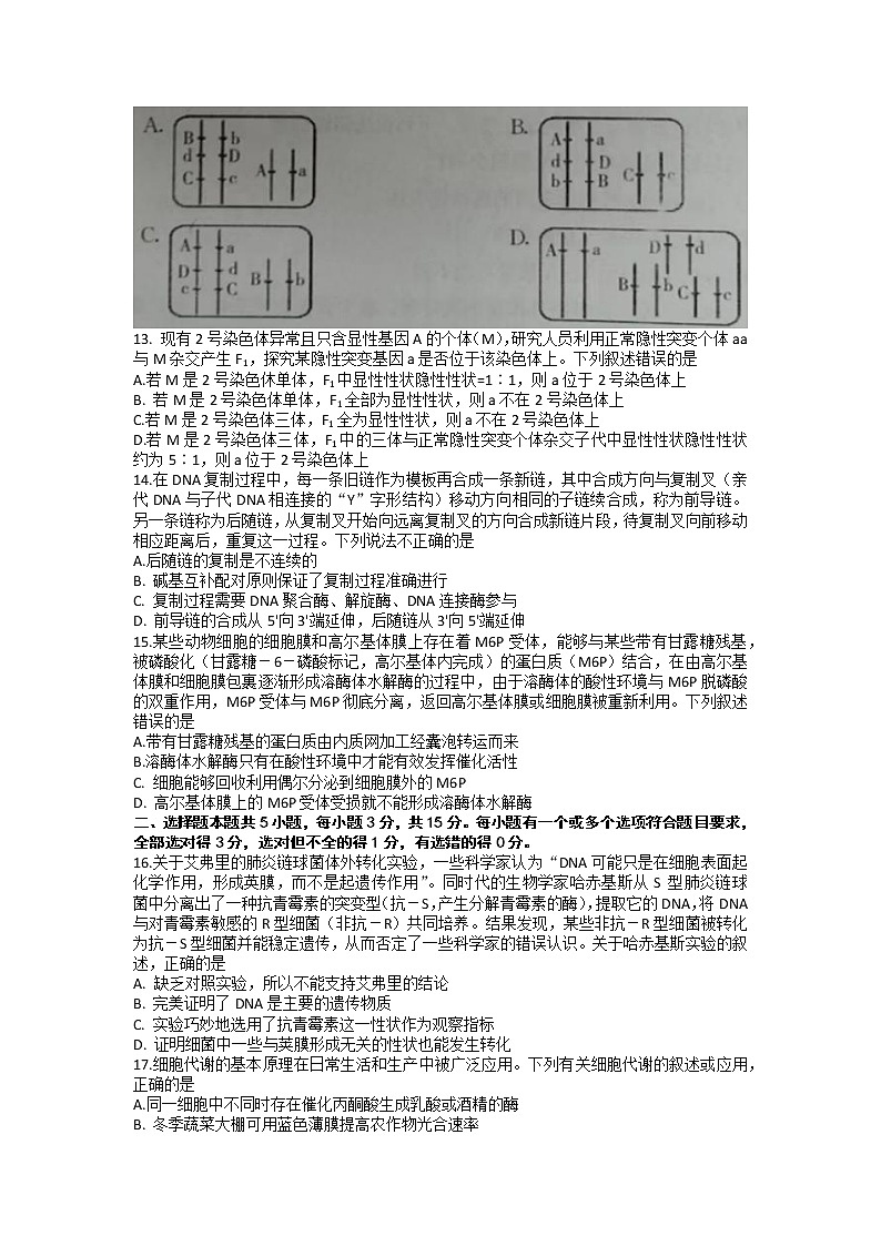 12.某动物细胞中位于常染色体上有四对等位基因A/a、B/b、C/c、D/d。用两个纯合个体交配得F1,F1测交结果为 aabbCcdd AaBbccDd aaBbCedd AabbecDd=1 ∶1∶1∶1。则体细胞中四对基因在染色体上的位置是