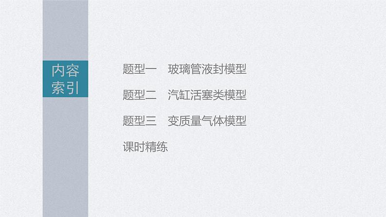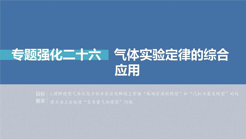 1.理解理想气体状态方程并会应用解题.2.掌握“玻璃管液封模型”和“汽缸活塞类模型”的处理方法.3.会处理“变质量气体模型”问题.
