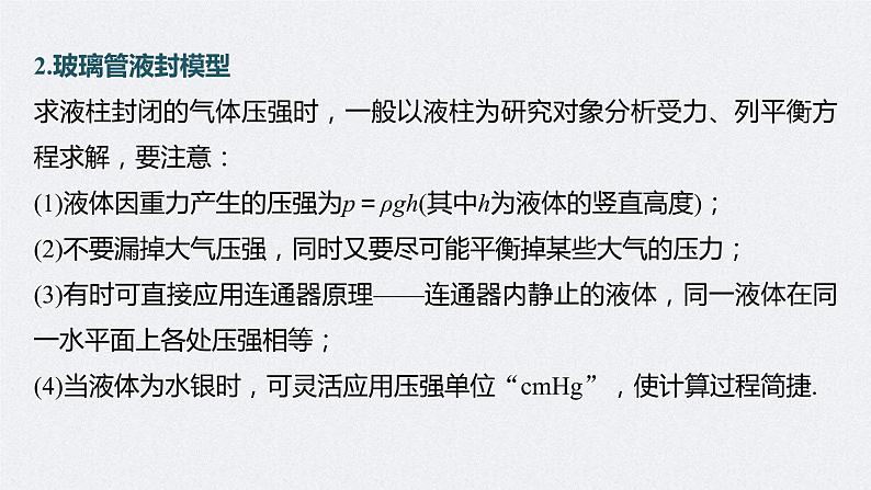 2.玻璃管液封模型求液柱封闭的气体压强时,一般以液柱为研究对象分析受力、列平衡方程求解,要注意:(1)液体因重力产生的压强为p=ρgh(其中h为液体的竖直高度);(2)不要漏掉大气压强,同时又要尽可能平衡掉某些大气的压力;(3)有时可直接应用连通器原理——连通器内静止的液体,同一液体在同一水平面上各处压强相等;(4)当液体为水银时,可灵活应用压强单位“cmHg”,使计算过程简捷.