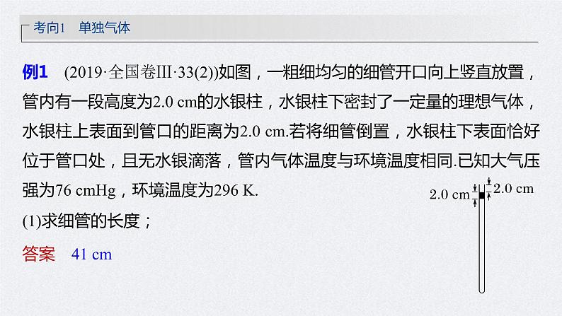 例1 (2019·全国卷Ⅲ·33(2))如图,一粗细均匀的细管开口向上竖直放置,管内有一段高度为2.0 cm的水银柱,水银柱下密封了一定量的理想气体,水银柱上表面到管口的距离为2.0 cm.若将细管倒置,水银柱下表面恰好位于管口处,且无水银滴落,管内气体温度与环境温度相同.已知大气压强为76 cmHg,环境温度为296 K.