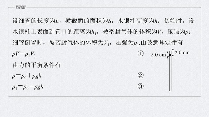 设细管的长度为L,横截面的面积为S,水银柱高度为h;初始时,设水银柱上表面到管口的距离为h1,被密封气体的体积为V,压强为p;细管倒置时,被密封气体的体积为V1,压强为p1.由玻意耳定律有pV=p1V1①由力的平衡条件有p=p0+ρgh②p1=p0-ρgh③