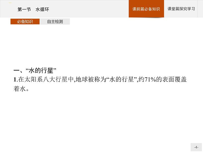 一、“水的行星”1.在太阳系八大行星中,地球被称为“水的行星”,约71%的表面覆盖着水。