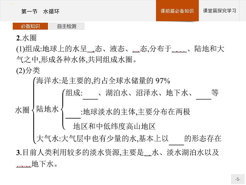 2.水圈(1)组成:地球上的水呈气态、液态、固态,分布于海洋、陆地和大气之中,形成各种水体,共同组成水圈。(2)分类