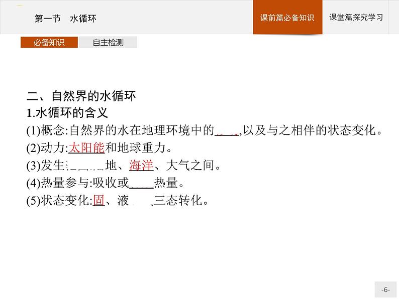 二、自然界的水循环1.水循环的含义(1)概念:自然界的水在地理环境中的移动,以及与之相伴的状态变化。(2)动力:太阳能和地球重力。(3)发生范围:陆地、海洋、大气之间。(4)热量参与:吸收或释放热量。(5)状态变化:固、液、气三态转化。