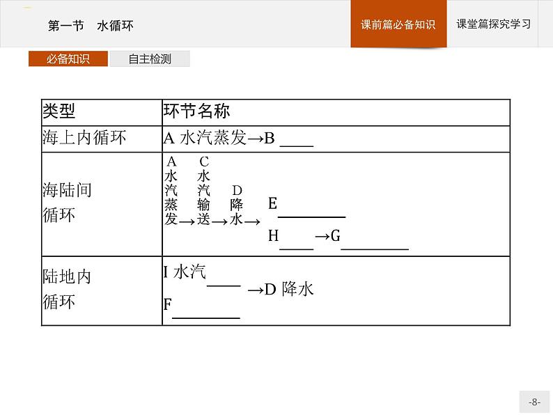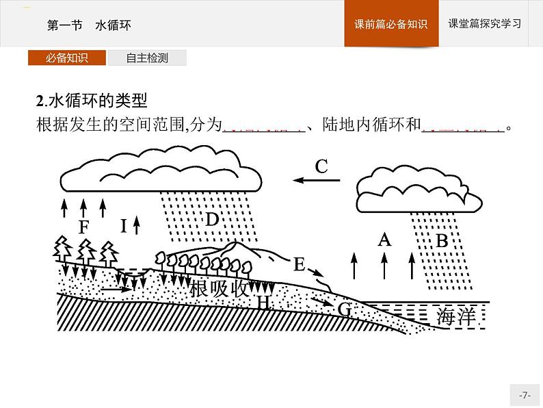 这是一份高中地理第一节 水循环说课课件ppt,共50页。PPT课件主要包含了必备知识,自主检测,探究一,探究二,素养培优,当堂检测,5影响下渗的因素,思维导引等内容,欢迎下载使用。