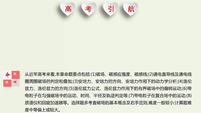 2024届高考物理一轮复习专题九磁场第1讲磁场 、磁场对电流的作用课件: 这是一份2024届高考物理一轮复习专题九磁场第1讲磁场 、磁场对电流的作用课件,共40页。PPT课件主要包含了N极的指向,处处相同,BIL,穿过手心,大拇指,答案A,电流周围的磁场,答案BC,答案B,答案D等内容,欢迎下载使用。