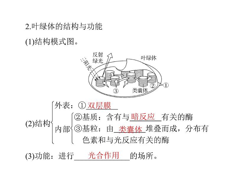 答案:×4.光合作用需要的色素和酶分布在叶绿体基粒和基质中。