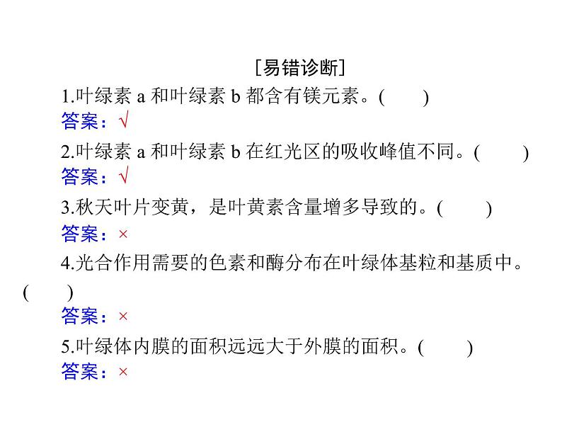 2.叶绿素 a 和叶绿素 b 在红光区的吸收峰值不同。(答案:√3.秋天叶片变黄,是叶黄素含量增多导致的。(
