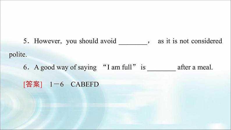 6.A good way of saying “I am full” is ________ after a meal.