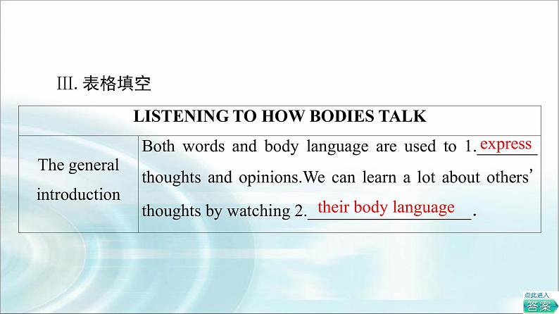 The general introduction | Both words and body language are used to 1.express thoughts and opinions.We can learn a lot about others' thoughts by watching 2.their body language. |