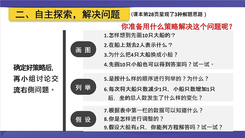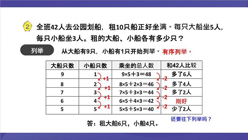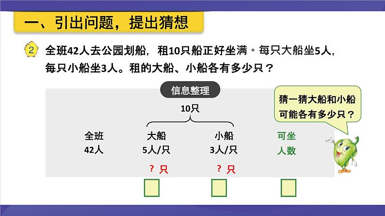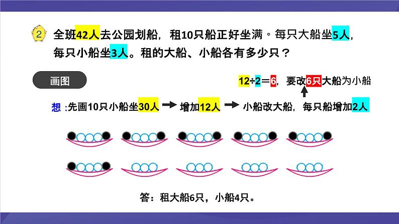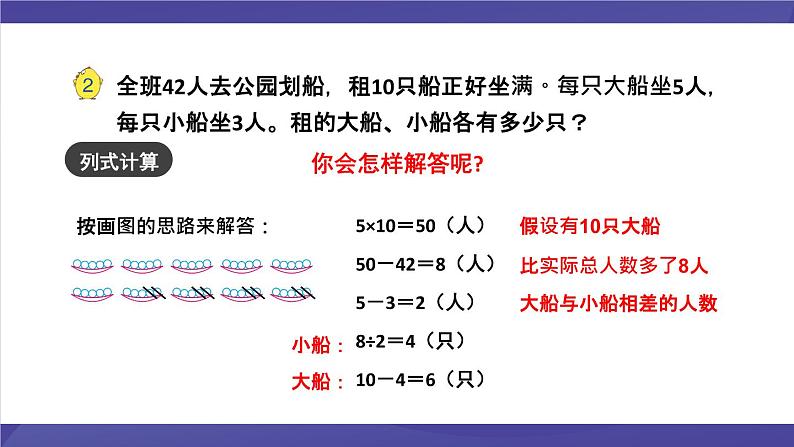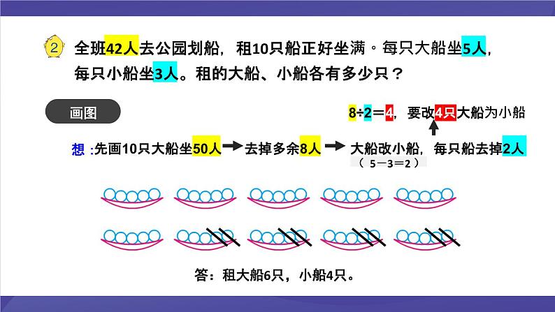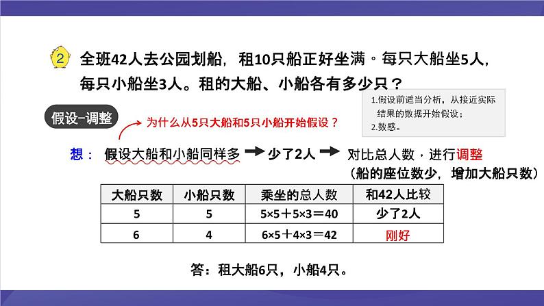 展开解决问题的策略(2)苏教版六年级下册三全班42人去公园划船,租10只船正好坐满。每只大船坐5人,每只小船坐3人。租的大船、小船各有多少只?全班42人大船5人/只小船3人/只可坐人数?只?只一、引出问题,提出猜想你准备用什么策略解决这个问题呢?(课本第28页呈现了3种解题思路)二、自主探索,解决问题先画10只大船坐50人想:答:租大船6只,小船4只。先画10只小船坐30人想:答:租大船6只,小船4只。从大船有9只,小船有1只开始列举。有序列举。828×5+2×3=46多了4人737×5+3×3=44多了2人646×5+4×3=42刚好555×5+5×3=40少了2人还要往下列举吗?答:租大船6只,小船4只。假设大船和小船同样多想:646×5+4×3=42刚好(船的座位数少,增加大船只数)答:租大船6只,小船4只。1.假设前适当分析,从接近实际 结果的数据开始假设;2.数感。你会怎样解答呢?按画图的思路来解答:5×10=50(人)50-42=8(人)5-3=2(人)8÷2=4(只)10-4=6(只)假设有10只大船比实际总人数多了8人大船与小船相差的人数小船:大船:3×10=30(人)42-30=12(人)5-3=2(人)12÷2=6(只)10-6=4(只)假设有10只小船比实际总人数相差的人数大船与小船相差的人数大船:小船:检验:6+4=10(只)5×6+3×4=42(人)答:租大船6只,小船4只。解:设大船大船有x只;则:小船有(10-x)只。5x+3×(10-x)=425x+30-3x=422x=12x=610-6=4(只)答:租大船6只,小船4只。比较这几种思路,它们有什么联系和区别?联系:无论是画图还是列举,都是 先假设,再对数据进行调整。区别:画图策略更直观清楚。 列举策略能有条理的一一列举; 假设策略更快捷。鸡和兔一共有8只,它们的腿有22条。鸡和兔各有多少只?1.(根据下面的提示,选择一种方法找出答案。)【教材P29练一练】鸡和兔一共有8只,它们的腿有22条。鸡和兔各有多少只?1.(根据下面的提示,选择一种方法找出答案。)①画8个圆,表示一共有8只动物。(1)按照下面的步骤画图。②假设8只都是鸡,给每只动物画2条腿。算一算画出的腿比22条少多少条。③一只兔比一只鸡多2条腿,给其中的几只动物添上2条腿,使画出的腿正好是22条。④鸡有( )只,兔有( )只。536÷(4-2)=3(只)假设给每只小动物画4条腿,怎样解答呢?4×8=32(条)32-22=10(条)4-2=2(条)每只兔比鸡多2条腿10÷2=5(只)鸡的只数8-5=3(只)兔的只数鸡和兔一共有8只,它们的腿有22条。鸡和兔各有多少只?1.(根据下面的提示,选择一种方法找出答案。)(2)先假设鸡和兔同样多,再调整。535×2+3×4=22刚好多2条都是先假设,再对数据进行调整。回顾(1)和(2)的方法,它们有什么相同之处?鸡和兔一共有8只,它们的腿有22条。鸡和兔各有多少只?1.(3)设兔有x只,则鸡有(8-x)只。(根据下面的提示,列方程解答。)4x+2×(8-x)=224x+16-2x=222x=6x=38-3=5(只)答:鸡有5只,兔有3只。鸡和兔一共有8只,它们的腿有22条。鸡和兔各有多少只?1.画图、列举、假设的策略都可以解决 “鸡兔同笼”类问题。六年级同学制作了78件蝴蝶标本,贴在9块展板上展出。每块小展板贴6件,每块大展板贴10件。两种展板各有多少块?1.【教材P31练习五第4题】用画图或列举的策略方便吗?若是100件、200件呢?假设两种展板的块数如下表,你能通过调整得出结果吗?636×10+3×6=78刚好答:大展板有6块,小展板有3块。三、巩固应用,自主体会2.【教材P31练习五第5题】根据表中数据,接着想一想、填一填,并找出答案。3103+10×0.5=8少了2元585+8×0.5=9少了1元767+6×0.5=10刚好答:1元硬币有7枚,5角硬币有6枚。回顾解决问题的过程,你有哪些体会?四、交流总结,回顾反思1.从教材习题中选取,2.完成练习册本课时的习题.