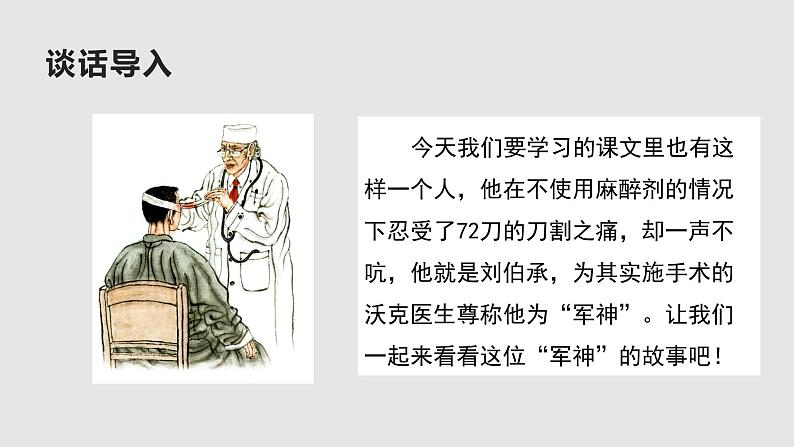 今天我们要学习的课文里也有这样一个人,他在不使用麻醉剂的情况下忍受了72刀的刀割之痛,却一声不吭,他就是刘伯承,为其实施手术的沃克医生尊称他为“军神”。让我们一起来看看这位“军神”的故事吧!