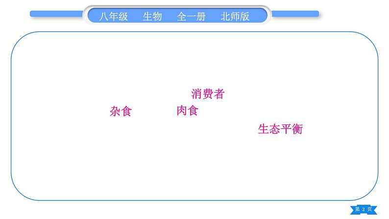 这是一份北师大版八年级生物上第5单元生物圈中的动物和微生物复习与提升二(第17章~第18章)习题课件,共19页。PPT课件主要包含了消费者,生态平衡,人为因素,遗传物质,生态环境,没有成形的细胞核,细胞膜,细胞质,细胞核,蛋白质等内容,欢迎下载使用。