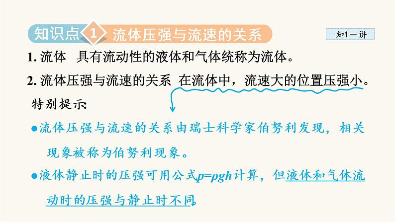 特别提示:●流体压强与流速的关系由瑞士科学家伯努利发现,相关现象被称为伯努利现象。●液体静止时的压强可用公式p=ρgh计算,但液体和气体流动时的压强与静止时不同。