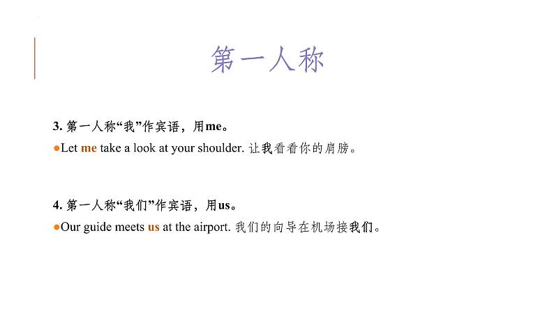3. 第一人称“我”作宾语,用me。●Let me take a lk at yur shulder. 让我看看你的肩膀。