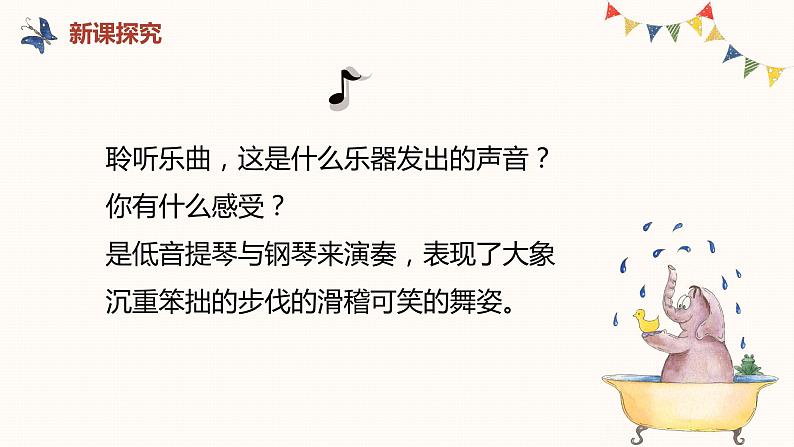 人音版音乐一年级下册《大象》教学设计课题名《大象》教学目标1.激发学生对大象等动物的喜爱之情。感受大象悠闲自在的样子和神态。体验乐曲中低沉的音色、诙谐的情绪。2.在活动过程中懂得人与动物共生的关系,学会尊重动物,保护动物。教学重点感受音乐的表现与事物的形象动态有直接的关系。教学难点体验乐曲中低沉的音色、诙谐的情绪。教学准备多媒体课件。教学过程一、课堂导入同学们你们见过大象吗?说说大象有什么特征?二、新课探究1、《大象》这首乐曲,作者取材于柏辽兹歌剧《浮士德的沉沦》中《风妖之舞》圆舞曲的片断。《大象》是法国作曲家圣–桑所作的管弦乐组曲《动物狂欢节》中的第五首。《动物狂欢节》,又称《动物园狂想曲》。这是一部形象生动、充满幽默谐趣的管弦乐组曲。2、聆听乐曲,这是什么乐器发出的声音?你有什么感受?是低音提琴与钢琴来演奏,表现了大象沉重笨拙的步伐的滑稽可笑的舞姿。3、低音提琴是擦奏弦鸣乐器,又称倍大提琴。提琴家族中体积最大、发音最低的弓弦乐器。演奏时要将琴放在地上,立着或靠在高凳上演奏。在此表现大象笨拙可爱的形象。4、第一部分:表现大象愉快地迈着笨重的脚步,费力地旋转舞蹈,给人以幽默可笑的感觉。第二部分:比较抒情,舒展而优美的旋律自由地在各调上模进、重复,犹如大象伸看鼻于在舒心地歌唱。第三部分:是第一部分的再现,最后在欢乐的气氛中结束。5、完整聆听:感受乐曲的情绪。三、课堂小结《大象》是法国作曲家圣-桑所作的管弦乐组曲《动物狂欢节》中的第五首。《动物狂欢节》, 又称《动物园狂想曲》。这是一部形象生动、充满幽默谐趣的管弦乐组曲。《大象》这首乐曲,作者取材于柏辽兹歌剧《浮士德的沉沦》中《风妖之舞》圆舞曲的片断。圣-桑将其改为低音提琴与钢琴来演奏,来表现大象沉重笨拙的步伐的滑稽可笑的舞姿。布置作业你还知道哪些关于大象的音乐作品,一起与同学分享。板书设计《大象》教学反思