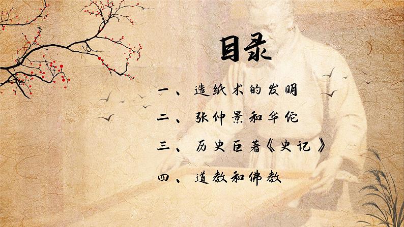 人教部编版七年级上册第十五课 两汉的科技和文化课文配套ppt课件: 这是一份人教部编版七年级上册第十五课 两汉的科技和文化课文配套ppt课件,共27页。PPT课件主要包含了青铜器,竹木简,古代书写材料,埃及欧洲两河流域,放马滩纸,蔡伦改进造纸术,旧鱼网,成就及地位,擅长技术,生活时期等内容,欢迎下载使用。