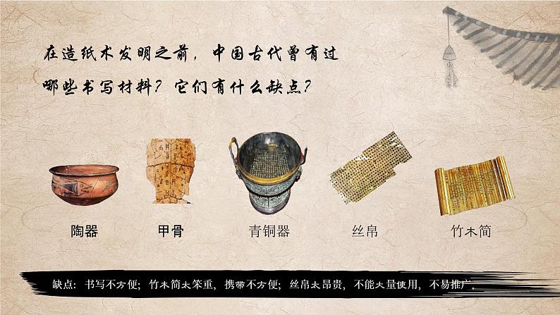 缺点:书写不方便;竹木简太笨重,携带不方便;丝帛太昂贵,不能大量使用,不易推广。