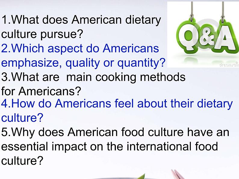 1.What des American dietary culture pursue?2.Which aspect d Americans emphasize, quality r quantity?3.What are main cking methds fr Americans?