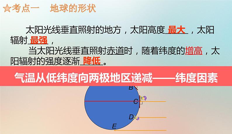 1.太阳高度与太阳辐射。2.地球的自转和公转。3.太阳直射点的移动规律、极昼和极夜现象、四季更替、五带的形成。