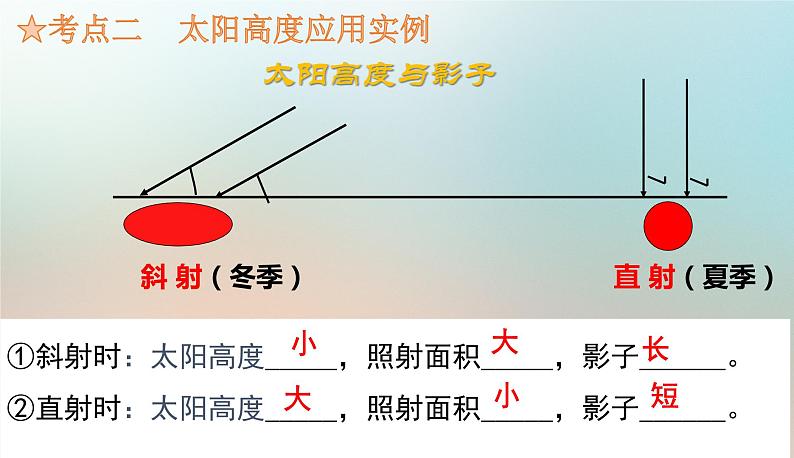 ①斜射时:太阳高度_____,照射面积_____,影子______。②直射时:太阳高度_____,照射面积_____,影子______。