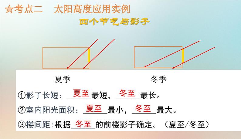 ①影子长短:______最短,______最长。②室内阳光面积:______最小,______最大。③楼间距:根据______的前楼影子确定。(夏至/冬至)