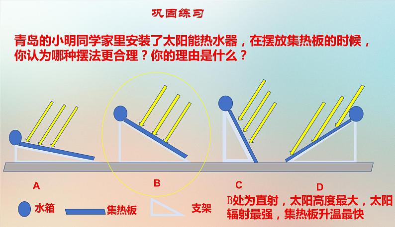 B处为直射,太阳高度最大,太阳辐射最强,集热板升温最快