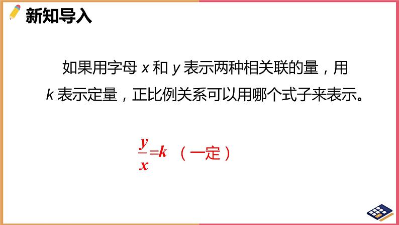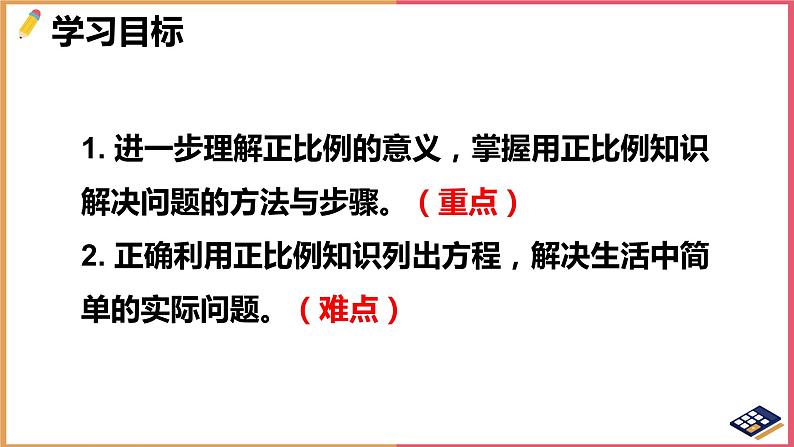 1. 进一步理解正比例的意义,掌握用正比例知识解决问题的方法与步骤。(重点)2. 正确利用正比例知识列出方程,解决生活中简单的实际问题。(难点)