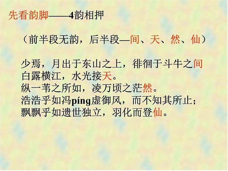 先看韵脚——4韵相押 (前半段无韵,后半段—间、天、然、仙) 少焉,月出于东山之上,徘徊于斗牛之间 白露横江,水光接天。 纵一苇之所如,凌万顷之茫然。 浩浩乎如冯pínɡ虚御风,而不知其所止; 飘飘乎如遗世独立,羽化而登仙。