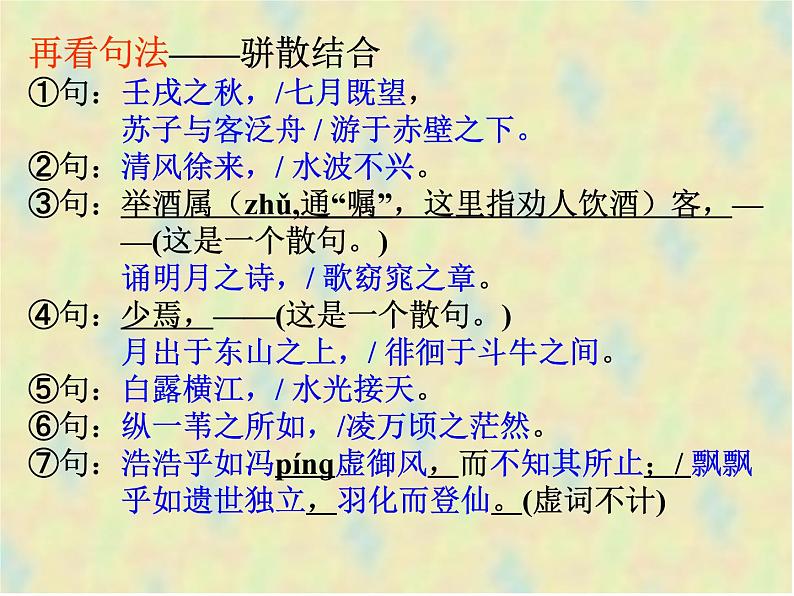 再看句法——骈散结合①句:壬戌之秋,/七月既望, 苏子与客泛舟 / 游于赤壁之下。②句:清风徐来,/ 水波不兴。③句:举酒属(zhǔ,通“嘱”,这里指劝人饮酒)客,— —(这是一个散句。) 诵明月之诗,/ 歌窈窕之章。④句:少焉,——(这是一个散句。) 月出于东山之上,/ 徘徊于斗牛之间。⑤句:白露横江,/ 水光接天。⑥句:纵一苇之所如,/凌万顷之茫然。⑦句:浩浩乎如冯pínɡ虚御风,而不知其所止;/ 飘飘 乎如遗世独立,羽化而登仙。(虚词不计)