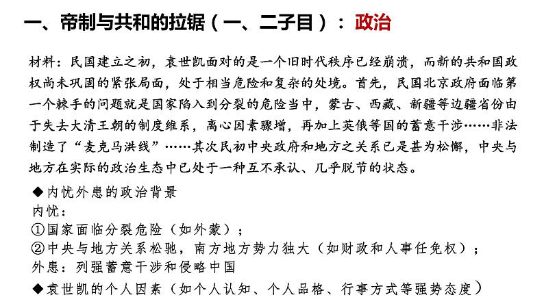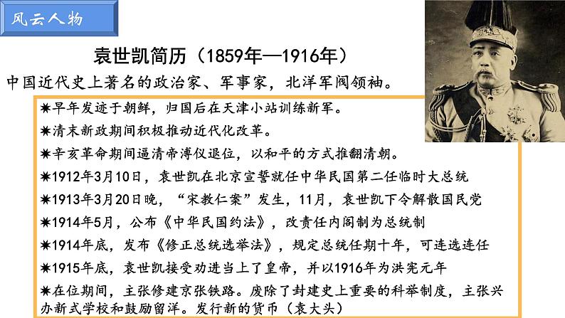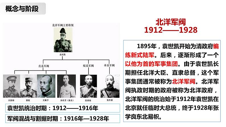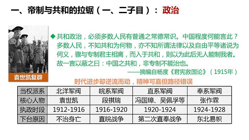 展开高中历史人教统编版(必修)中外历史纲要(上)第20课 北洋军阀统治时期的政治、经济与文化教学演示ppt课件: 这是一份高中历史人教统编版(必修)中外历史纲要(上)第20课 北洋军阀统治时期的政治、经济与文化教学演示ppt课件,共29页。PPT课件主要包含了北洋军阀统治时期,帝制共和两徘徊,冯国璋,东北三省,浙闽鲁陕,段祺瑞,张作霖,探究一北洋军阀割据,社会生活新气象,民族工业“黄金时期”等内容,欢迎下载使用。