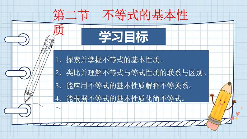 展开1、探索并掌握不等式的基本性质。2、类比并理解不等式与等式性质的联系与区别。3、能应用不等式的基本性质解释不等关系。4、能根据不等式的基本性质化简不等式。