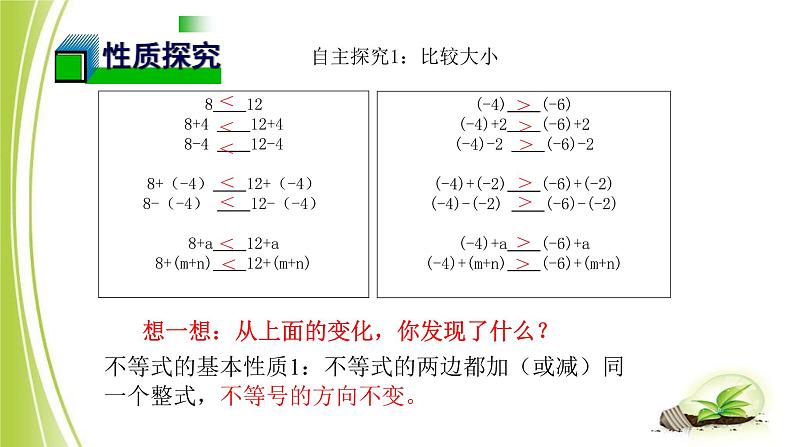 数学2 不等式的基本性质评课课件ppt: 这是一份数学2 不等式的基本性质评课课件ppt,共23页。PPT课件主要包含了+12+1,你发现什么规律啦,情境互动,-23-2,不等式的基本性质,合作探究一,归纳概括,方向不变,同一整式,符号语言等内容,欢迎下载使用。