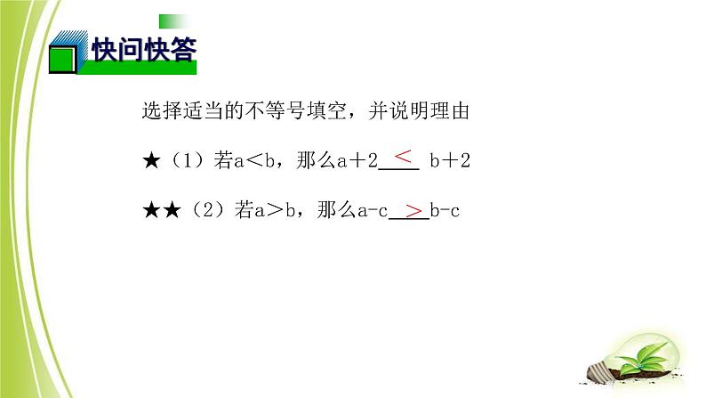 选择适当的不等号填空,并说明理由★(1)若a<b,那么a+2 b+2★★(2)若a>b,那么a-c b-c