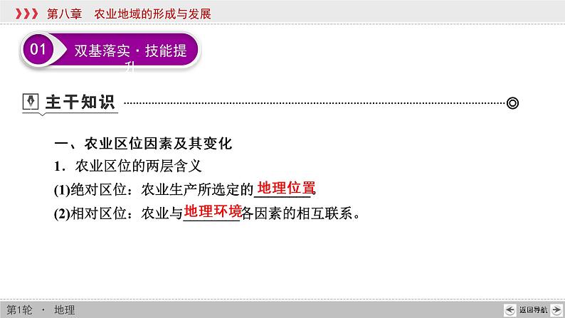 一、农业区位因素及其变化1.农业区位的两层含义(1)绝对区位:农业生产所选定的________。(2)相对区位:农业与________各因素的相互联系。